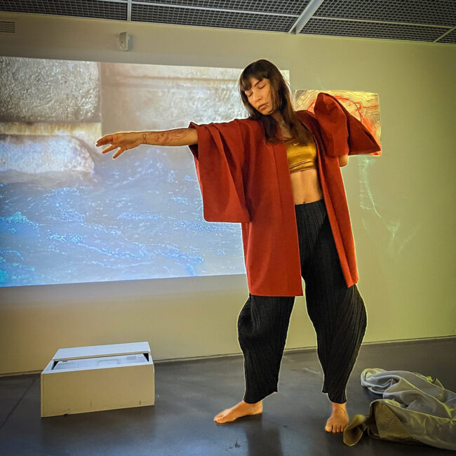By conducting a primarily visual and bodily experience-based artistic research and drawing connections between constructed binaries and dichotomies, she questions global narratives about gender roles, identities and more recently about climate and ocean emergencies with a multidisciplinary approach, aiming for creating a disturbance of predisposed personal and social structures.