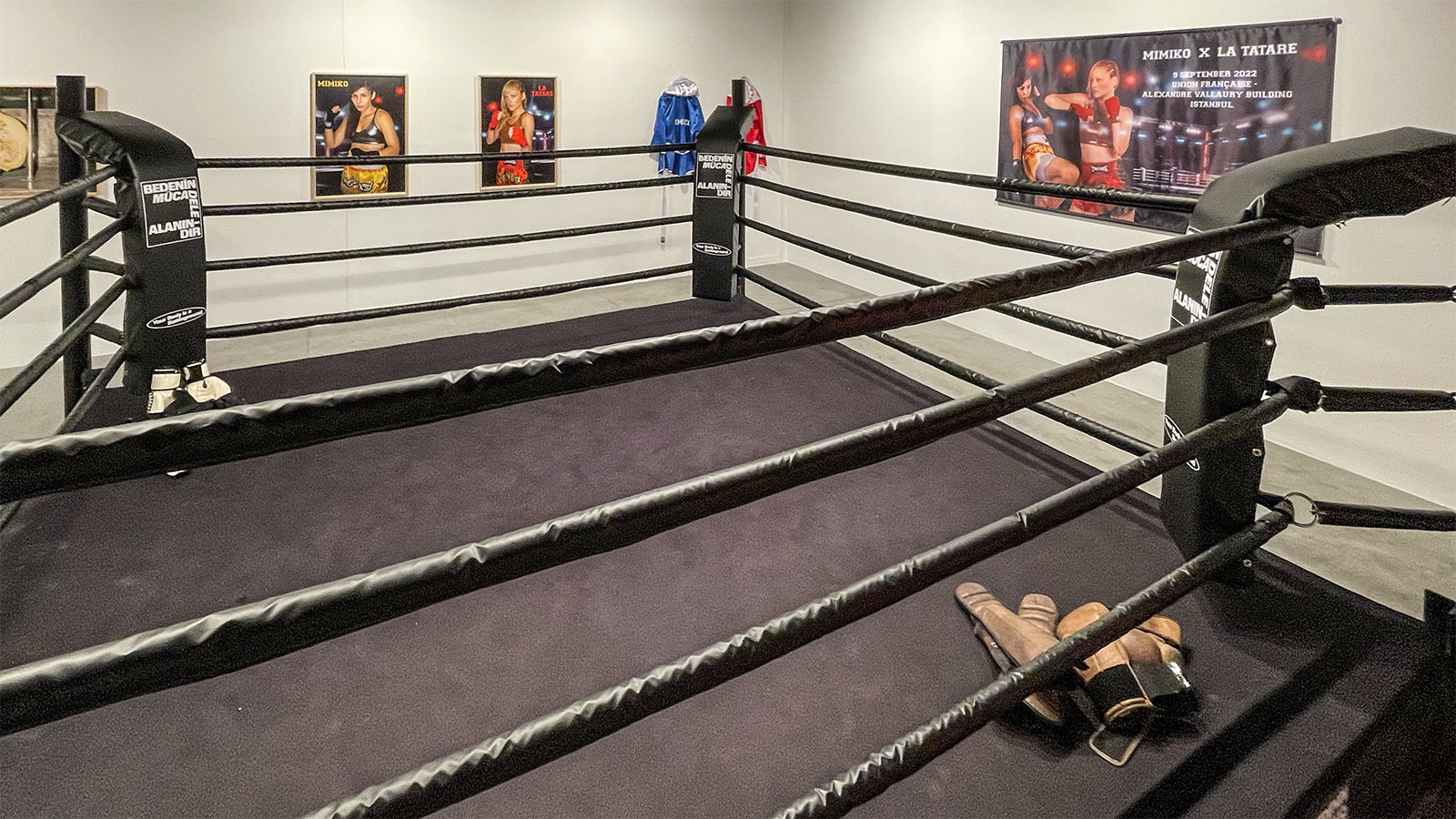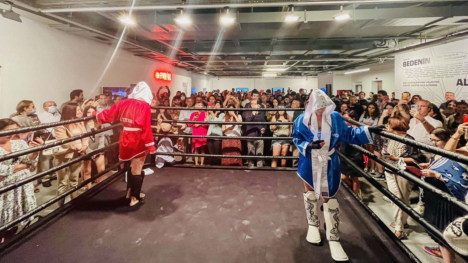 Mimiko, whose practice is based on observing, understanding, and experiencing the body, body identities and socially constructed identities, steps into the ring to face the writer and art critic Bihter Sabanoğlu. Believing that people rather choose a path with familiar hardships and pain in a life full of uncertainties, the artist transforms the combat sport, which she suggests some may perceive as a controlled simulation of life, into a performance. The performance is concerned with distorting perceptions of the body, particularly the societal view of women’s fragility, and reflects on the question “How can rivalry in a ring evolve into solidarity, and the need for self-defense into exploring the strength and capability of the body?” The manifesto / text read between the rounds touches upon the different states of being within and inside the ring as well as in life in relation to the expression ‘fight like a girl’.