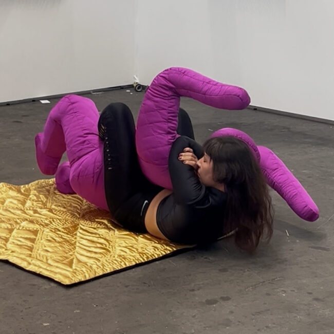 2025, Performance with an MMA grappling dummy crafted from traditional duvet, satin and nylon fabric, stitches, synthetic fiber and shredded foam, 122 x 70 x 53 cm, Duration: 10 minutes